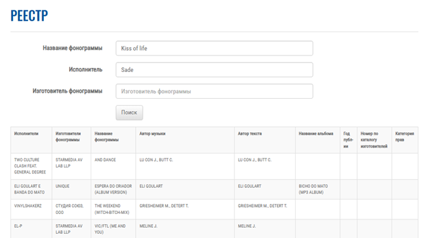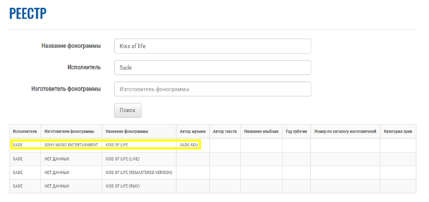 2 - находим нужное произведение: если в столбце "изготовитель фонограммы" указана продюсерская или звукозаписывающая компания, то с вероятностью 90% именно она является правообладателем
