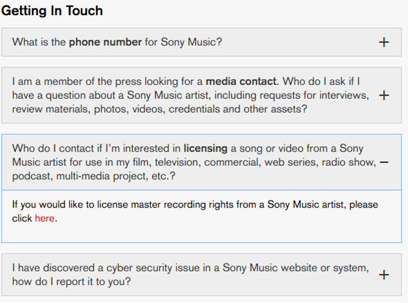 3 - находим в Интернете сайт звукозаписывающей компании (в нашем случае - Sony Music Entertainment) и с помощью встроенного переводчика ищем раздел, посвященный лицензированию (здесь он оказался в разделе FAQ)
